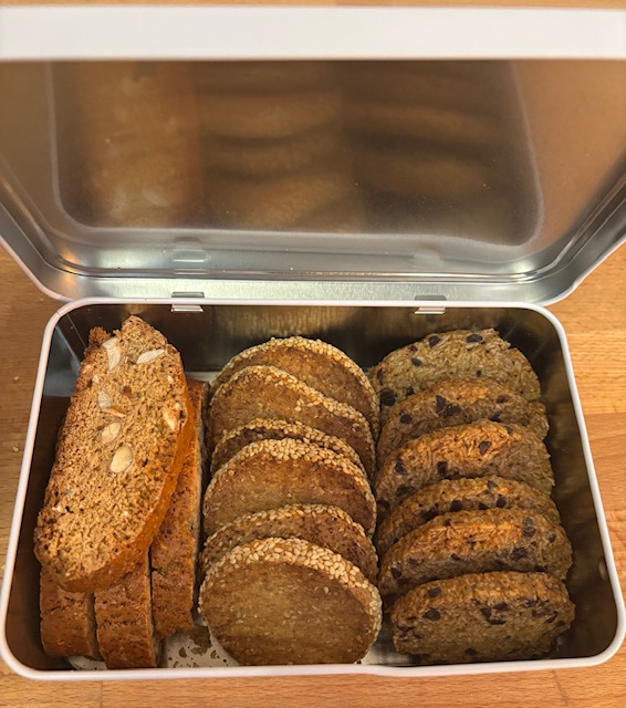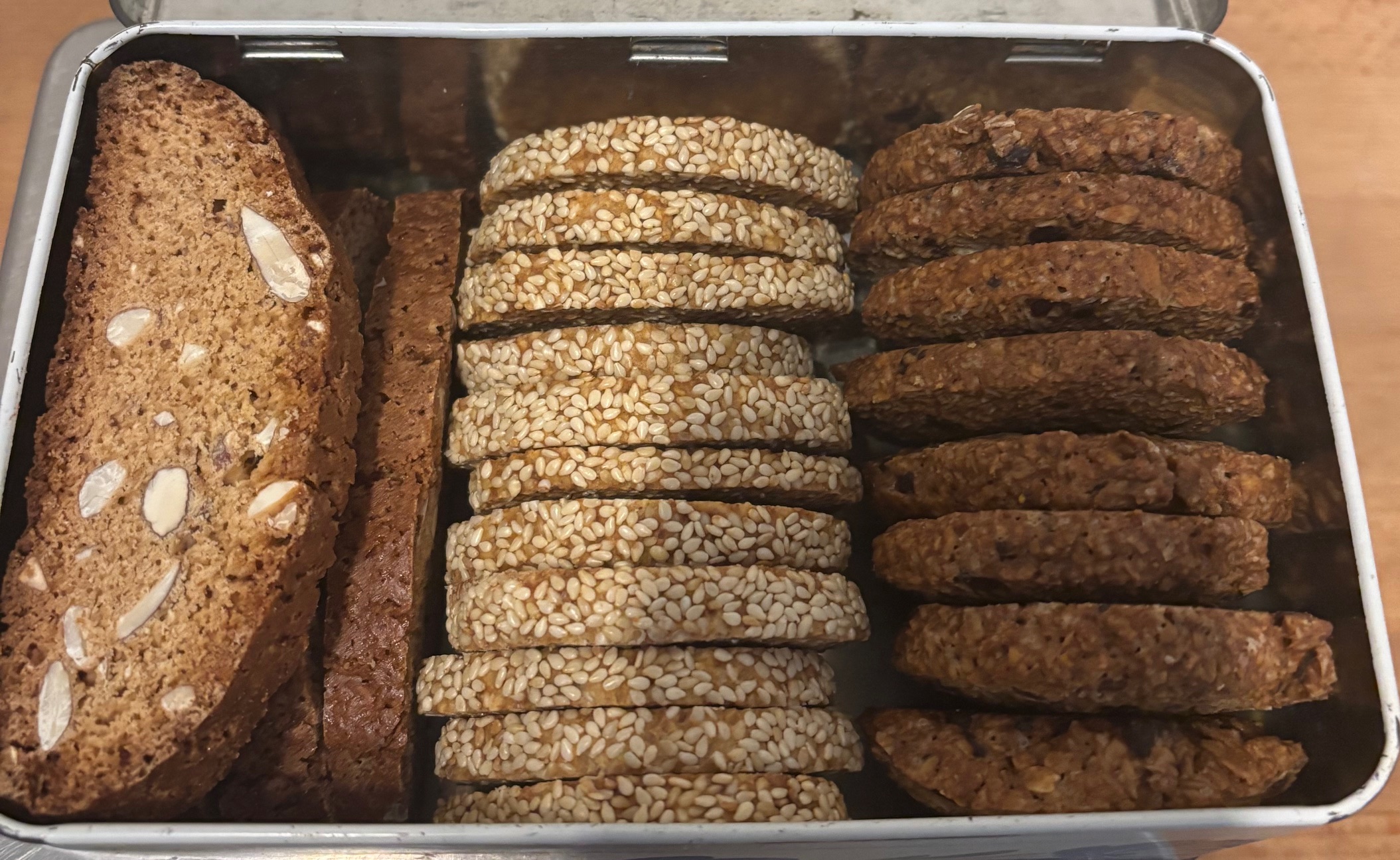 Contenant : Environ 440 g soit environ 140 g de Cantuccini, environ 150 g de Palet de Chocolat, environ 150 g de Sablés Sésame.